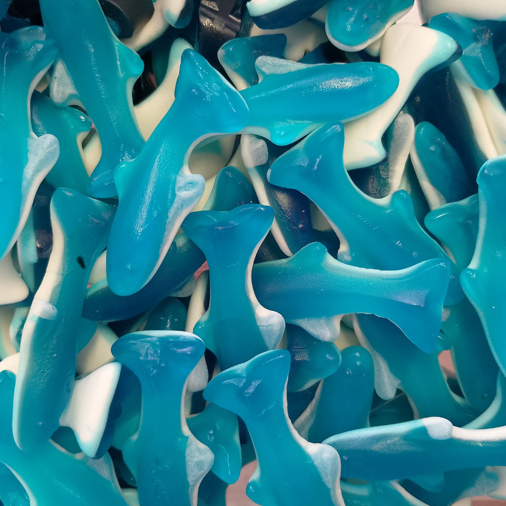Блестящие жевательные конфеты в форме акул.